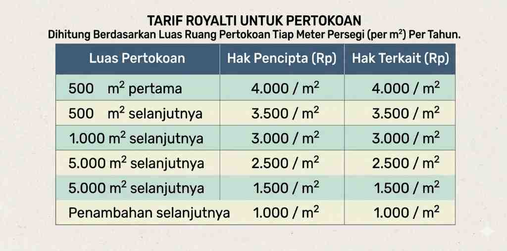 Tarif Royalti untuk Pertokoan, dihitung berdasarkan Luas Ruang Pertokoan tiap meter persegi (per m2) per tahun, dengan ketentuan sebagai berikut: