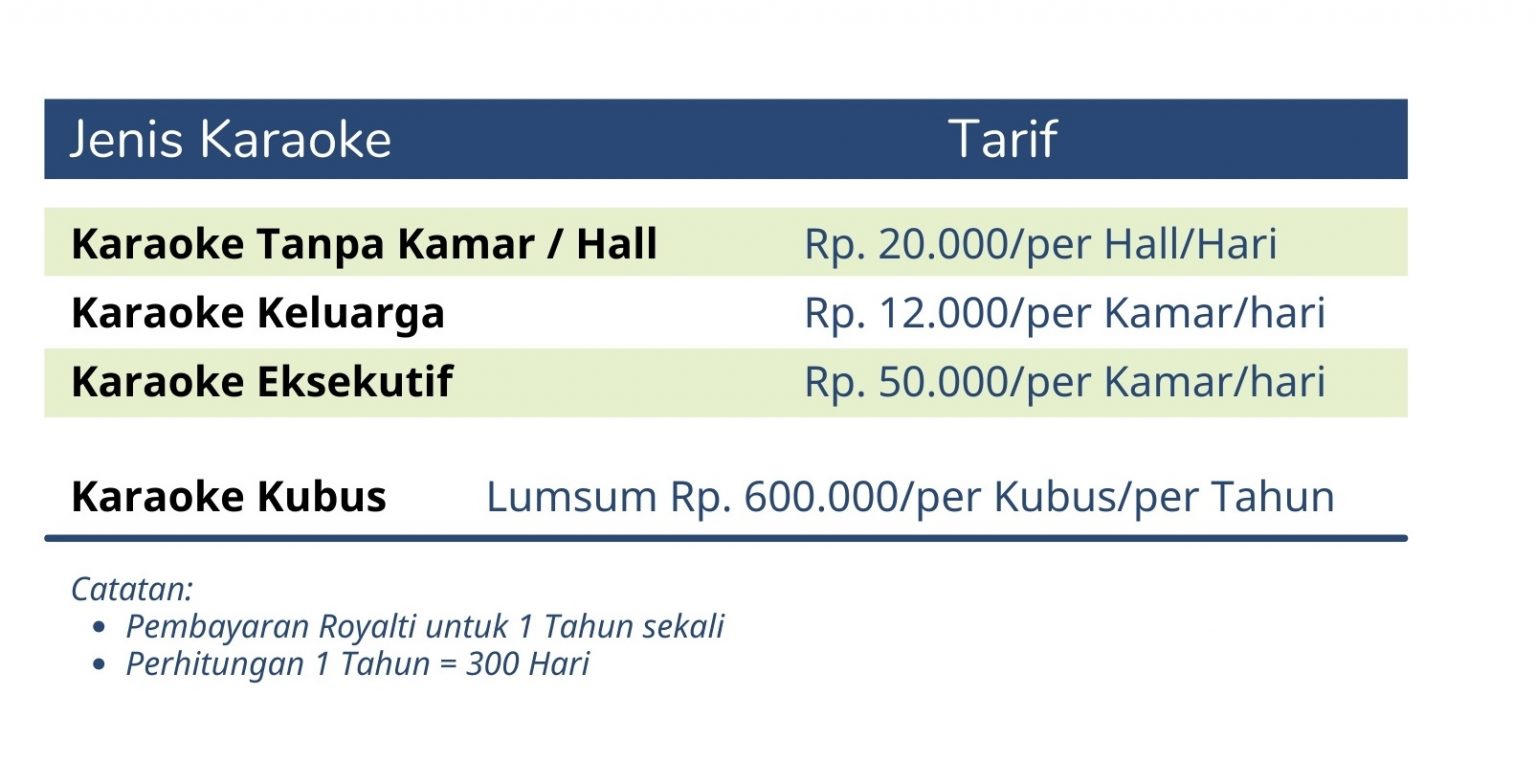 Berdasarkan Keputusan Menteri Hukum dan HAM RI No. HKI.2.OT.03.01-03 Tahun 2016, Tarif Royalti Rumah Bernyanyi (Karaoke)