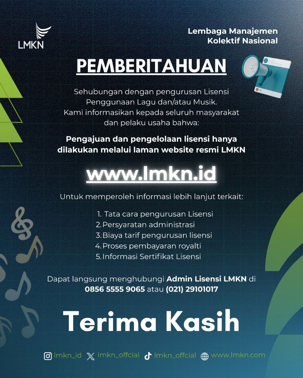“Seluruh pengurusan lisensi lagu dan/atau musik wajib dilakukan secara resmi melalui website LMKN. Kami tidak melayani pengurusan melalui DM, perantara, atau jalur yang tidak jelas,” tegas LMKN, Selasa, 23 Desember 2025.