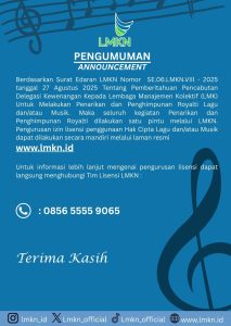 JAKARTA – Lembaga Manajemen Kolektif Nasional (LMKN) menghormati langkah tujuh pencipta lagu dan musisi yang mengajukan permohonan uji materiil terhadap Peraturan Pemerintah (PP) Nomor 56 Tahun 2021 dan Peraturan Menteri Hukum (Permenkum) Nomor 27 Tahun 2025. Para pencipta lagu tersebut adalah Ali Akbar, Eko Saky, Vien Adiyanti, Rento Saky, Ugie Uturia, Arie Zain, dan Enteng […]